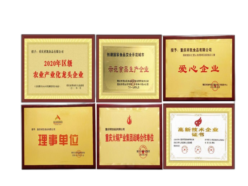 公司先后通過ISO三體系認(rèn)證,知識產(chǎn)權(quán)認(rèn)證,兩化融合A級認(rèn)證,有系統(tǒng)的多層次員工培訓(xùn)體系。2019年成為“示范食品生產(chǎn)企業(yè)”,2020-2023年被授予“區(qū)級農(nóng)業(yè)產(chǎn)業(yè)化龍頭企業(yè)”,2022年獲得高新技術(shù)企業(yè)(證書編號GR202251101662),是重慶江湖菜發(fā)展促進(jìn)會理事單位,重慶火鍋產(chǎn)業(yè)集團(tuán)副會長單位,也是重慶輕工職業(yè)學(xué)院共建單位,重慶食品工業(yè)研究所合作單位。